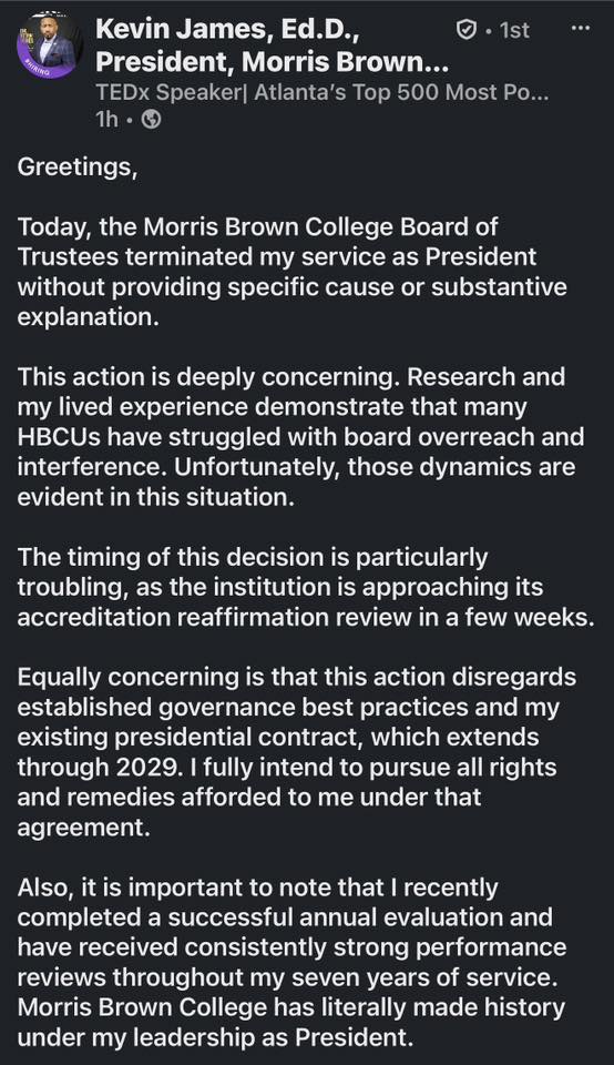 Dr. Kevin James, who led Morris Brown College through one of the most significant periods in its modern history, Heannounced Monday that the school’s Board of Trustees terminated his presidency without providing specific cause or substantive explanation. The shocking dismissal comes just weeks before the Atlanta HBCU is scheduled to undergo a critical accreditation reaffirmation review.